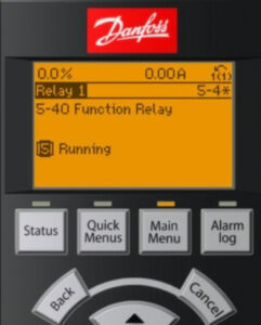 Option 1: This option to check the VFD on an HVAC system is typically default from the factory. Set one of the relay outputs 5-40 to “[5] Running”. This tells you that the drive has a start signal and is trying to run the motor.